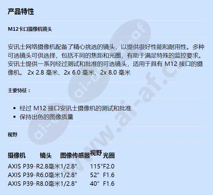 M12卡口摄像机镜头 安讯士网络摄像机配备了精心挑选的镜头,以提供很好性能和耐用性。多种可选镜头可供选择,包括不同的焦距和光圈,有助于满足特殊的监控要求。安讯士提供一系列经过测试和批准的可选镜头,适用于具有 M12 接口的摄像机。 2x 2.8 毫米、2x 6.0 毫米、2x 8.0 毫米 主要特征: 经过 M12 接口安讯士摄像机的测试和批准 保持出色的图像质量 视野 摄像机 镜头 图像传感器 视野 光圈 AXIS P39-R 2.8毫米 1/2.8" 115° F2.0 AXIS P39-R 6.0毫米 1/2.8" 52° F1.6 AXIS P39-R 8.0毫米 1/2.8" 40° F1.6