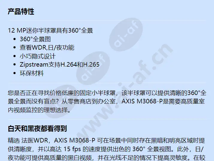 12 MP迷你半球罩具有360°全景 360°全景图 查看WDR,日/夜功能 小巧隐式设计 Zipstream支持H.264和H.265 环保材料 您是否正在寻找价格低廉的固定小半球罩,该半球罩可以提供清晰的360°全景全景而没有盲点?从零售商店到办公室,AXIS M3068-P是需要高质量室内视频监控的理想选择。 白天和黑夜都看得到 精选 法医WDR ,AXIS M3068-P 可在场景中同时存在黑暗和明亮区域时提供清晰度,并以高达 15 fps 的速度提供出色的 360° 全景视图。此外,日/夜功能可提供高质量的黑白视频,并在光线不足的情况下提高灵敏度。在较小的设施中,只需一台摄像机即可监控整个区域。摄像机不仅可以为您提供完整而清晰的概览,还可以让您放大和分析实时或录制的视频片段。无论事件发生在空间的中间还是远处的角落,借助反扭曲功能,您始终可以看到特定区域的无失真视图。 AXIS M3068-P 可以提供各种去扭曲视图,您可以同时从摄像机获取多个单独配置的视频流。 时尚,可持续的设计 这款超紧凑,不含PVC的摄像机由71%的再生塑料制成,无论安装在哪里,它的外观都显得隐式。 它带有白色外壳,具有圆滑的无半球罩设计。 还有其他可选的外壳,例如黑色外壳,烟雾探测器外壳(有助于掩盖摄像机)以及防破坏外壳,以提高安全性和安心感。 此外,摄像机的外壳可以重新粉刷以与特定环境无缝融合。 物有所值 这种价格很有吸引力的固定迷你半球罩有助于确保顺利安装并保持低成本。它开箱即用,以工厂为中心,因此不需要聚焦。而且,借助数字滚动功能,您可以远程调整摄像机概览的旋转 - 无需在摄像机上手动进行。此外,Axis Zipstream 支持 H.264 和 H.265 视频压缩的技术在不影响图像质量的情况下显着降低了带宽和存储要求。 图像传感器 CMOS 图像传感器大小 1/1.7 宽动态范围