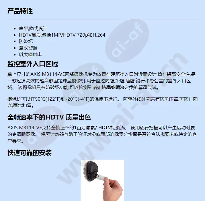 扁平,隐式设计 HDTV品质,包括1MP/HDTV 720p和H.264 防破坏 篡改警报 以太网供电 监控室外入口区域 掌上尺寸的AXIS M3114-VE网络摄像机专为放置在建筑物入口附近而设计,旨在提高安全性,是一款经济高效的超离散固定球型摄像机,用于监控商店,饭店,酒店,银行和办公室的室外入口区域。 该摄像机具有防破坏功能,可以检测到诸如堵塞或喷漆之类的篡改尝试。 摄像机可以在50°C(122°F)到-20°C(-4°F)的温度下运行。 防紫外线外壳带有防风雨罩,可防止阳光,雨水和雪。 全帧速率下的HDTV 质量出色 AXIS M3114-VE支持全帧速率的1百万像素/ HDTV视频流。 使用逐行扫描可以产生运动对象的更清晰图像。 像素计数器有助于验证对象或面部的像素分辨率是否符合法规要求或特定的客户要求。 快速可靠的安装 包装中提供了镜头工具 摄像机设计用于快速安装。 通过使用提供的镜头工具来引导和旋转固定镜头和图像传感器的球,可以轻松实现所需的视野和水平的图像。 以太网供电支持进一步简化了安装,因为仅需一根电缆即可传输电源和视频。 佩珀尔镇 Pepperell镇使用安讯士网络摄像机来保护市政建筑物和十字路口的安全 图像传感器 CMOS 图像传感器大小 1/4 最低照度/感光度(彩色) 1 lux 最大视频分辨率 1280x800 每秒最大帧数 30 水平视场* 80 / 80 / 105 ° 垂直视场* 48 / 48 / 67 ° H.264 基线,配置 Motion JPEG 是 PoE等级 1 工作温度 -20至50°C 室外准备就绪 是 防破坏等级 IK08 防护等级 IP66, IP67