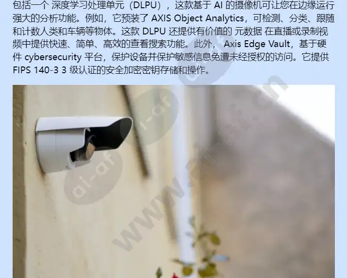 AI 驱动的 4 MP 炮塔式摄像机 4 MP 的出色图像质量 WDR、Lightfinder 和 OptimizedIR 黑色或白色可选 基于人工智能的视频分析 Axis Edge Vault 内置网络安全 这款炮塔式、人工智能驱动的半球摄像机可提供出色的 4 MP 图像质量。借助 AXIS Object Analytics,它可以检测和分类人类和车辆等物体。它可在室内和室外灵活安装。 出色的图像质量 AXIS M3126-LVE 提供出色的 4 MP 分辨率和 130° 视野。内置 优化红外 根据场景不同,可在 20 米(65 英尺)或更远的完全黑暗环境中进行监控。因此,无需额外的照明 — 您可以在白天和夜晚进行不显眼的监控。此外,WDR 可在场景中同时存在明暗区域时保留细节。并且 Axis Lightfinder 技术确保在弱光条件下提高光敏度并保证色彩清晰。 功能强大,安全可靠 包括一个 深度学习处理单元(DLPU) ,这款基于 AI 的摄像机可让您在边缘运行强大的分析功能。例如,它预装了 AXIS Object Analytics,可检测、分类、跟随和计数人类和车辆等物体。这款 DLPU 还提供有价值的 元数据 在直播或录制视频中提供快速、简单、高效的查看搜索功能。此外, Axis Edge Vault ,基于硬件 cybersecurity 平台,保护设备并保护敏感信息免遭未经授权的访问。它提供 FIPS 140-3 3 级认证的安全加密密钥存储和操作。 灵活、适合户外使用 这款平面半球摄像机旨在抑制光反射,提供出色的图像质量和可用性。它可在室内和室外灵活安装。此外,它还配有一套多功能安装配件,包括吊架套件、导管底盒和嵌入式安装套件,可安装在墙壁或天花板上。它小巧而低调,有黑色或白色可供选择,可与不同的环境融为一体。此外,这款防风雨摄像机的防护等级为