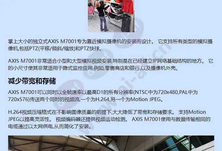 紧凑且经济高效 所有分辨率下的全帧速率 同时H.264和Motion JPEG 云台支持 以太网供电 高性能单通道解决方案 单通道AXIS M7001视频编码器提供了高度紧凑的设计以及出色的H.264性能。 它为将少量或大量的模拟CCTV摄像机集成到基于IP的视频监控系统中提供了一种简单且经济高效的解决方案。 通往更智能CCTV系统的简便方法 掌上大小的独立式AXIS M7001专为靠近模拟摄像机的安装而设计。 它支持所有类型的模拟摄像机,包括PTZ(平移/倾斜/缩放)和PTZ快球。 AXIS M7001非常适合小型和大型模拟视频安装,特别是在已经建立IP网络基础结构的地方。 它的小尺寸使其非常适用于隐式监控应用,例如,零售商店和银行,以及摄像机外壳。 减少带宽和存储 AXIS M7001可以同时以全帧速率以最高D1的所有分辨率(NTSC中为720x480,PAL中为720x576)传送两个同时的视频流,一个为H.264,另一个为Motion JPEG。 H.264视频压缩格式在不影响图像质量的前提下,大大降低了带宽和存储要求。 支持Motion JPEG以提高灵活性。 视频编码器还提供视频运动检测。 AXIS M7001使用与数据传输相同的电缆通过以太网供电,从而简化了安装。 捷克航空控股公司 (布拉格W茨拉夫·哈维尔机场) 使用安讯士网络摄像机提高民航安全性,有效预防犯罪并增强操作控制
