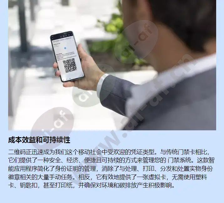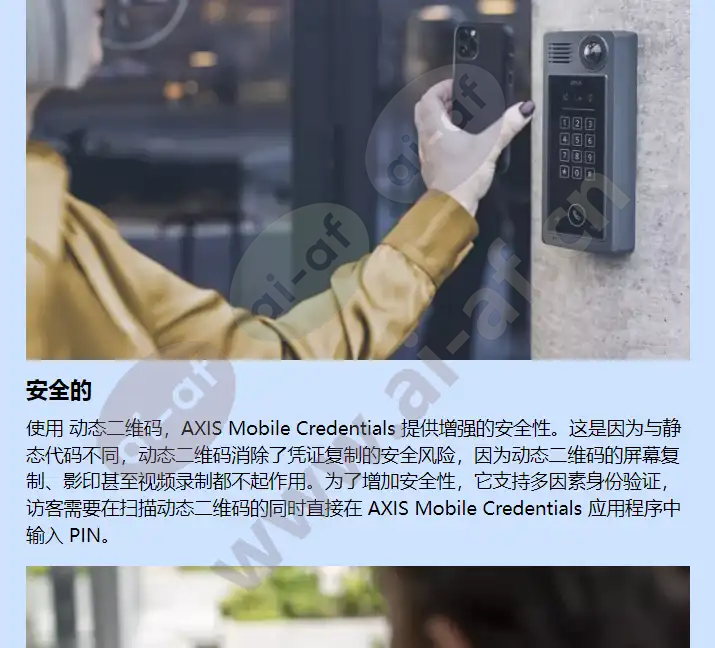 方便访客访问 智能、便捷、高性价比的解决方案 适合当今移动化的社会 使用二维码即时访问 支持静态和动态二维码 兼容 AXIS Camera Station 安全进入 这款智能、经济高效、基于二维码的应用程序可确保安全、高效和可靠的访问控制。非常适合当今的移动社会,它支持静态和动态二维码作为凭证。 轻松、灵活的访问 AXIS Mobile Credential 是一款智能、便捷的访客访问解决方案,可以接受 二维码 作为凭证。这款用户友好的应用程序具有直观的用户界面,可兼容 AXIS Camera Station 安全进入 并支持静态和动态二维码。 安全的 使用 动态二维码 ,AXIS Mobile Credentials 提供增强的安全性。这是因为与静态代码不同,动态二维码消除了凭证复制的安全风险,因为动态二维码的屏幕复制、影印甚至视频录制都不起作用。为了增加安全性,它支持多因素身份验证,访客需要在扫描动态二维码的同时直接在 AXIS Mobile Credentials 应用程序中输入 PIN。 成本效益和可持续性 二维码正迅速成为我们这个移动社会中受欢迎的凭证类型。与传统门禁卡相比,它们提供了一种安全、经济、便捷且可持续的方式来管理您的 门禁系统 。这款智能应用程序简化了身份证明的管理,消除了与处理、打印、分发和处置实物身份徽章相关的大量手动任务。相反,它有效地提供了一张虚拟卡,无需使用塑料卡、钥匙扣,甚至打印纸,并确保对环境和碳排放产生积极影响。