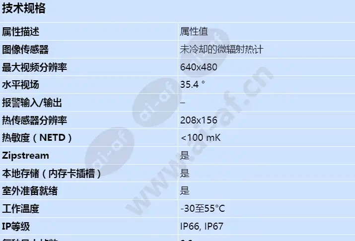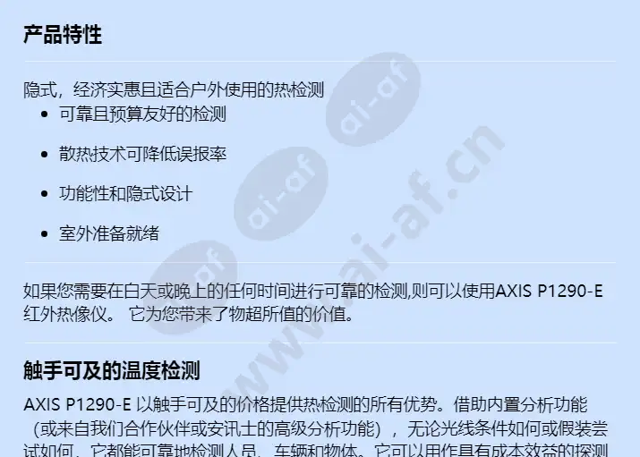 隐式,经济实惠且适合户外使用的热检测 可靠且预算友好的检测 散热技术可降低误报率 功能性和隐式设计 室外准备就绪 如果您需要在白天或晚上的任何时间进行可靠的检测,则可以使用AXIS P1290-E红外热成像摄像机。 它为您带来了物超所值的价值。 触手可及的温度检测 AXIS P1290-E 以触手可及的价格提供热检测的所有优势。借助内置分析功能(或来自我们合作伙伴或安讯士的高级分析功能),无论光线条件如何或假装尝试如何,它都能可靠地检测人员、车辆和物体。它可以用作具有成本效益的探测器,可在多种环境中为人员和财产安全提供视觉确认。它还有助于减少误报。 隐私至上 AXIS P1290-E可用作传感器,以避免损害隐私,例如学校和疗养院–热成像可以检测事件,而不会在图像中透露人员的个人详细信息。 结合分析功能,热成像摄像机可以响应患者或住院病人跌倒而触发警报或警报,使工作人员能够立即采取行动。 距离范围 焦距 可视角度 侦测 毫米 水平 人: 1.8 x 0.5 m 车辆: 4 x 1.5 m m 码 m 码 检测(目标上1.5像素) 4 35.4° 166 182 511 559 识别(目标上6像素) 4 35.4° 41 45 127 139 识别(目标上12像素) 4 35.4° 20 22 63 69 范围是根据约翰逊的标准计算的,它们纯粹是理论上的。这些值可能会在不同的天气条件下有所不同。有关 Johnson 标准的详细信息,请阅读白皮书。 视频分析强大 AXIS P1290-E 强大的处理器让您可以将市场上最广泛的视频分析解决方案选择添加到您的监控解决方案中。例如,我们合作伙伴的视频分析应用程序通过分析检测到的事件、自动消除非威胁事件并立即通知安全人员潜在的危急情况,从而支持对检测到的事件做出快速和适当的响应。然后,您的员工可以查看清晰、详细的镜头,以确定威胁的确切性质