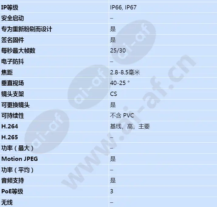 提供 4K 分辨率的很好细节 温度范围:-40°C至55°C(-40°F至131°F) 觅光者和 WDR 宽动态猎影技术 i-CS 镜头可提供清晰图像且易于安装 Zipstream AXIS P1368-E Network Camera 是一款非精制户外专用摄像机,在不同环境下可提供 4K 分辨率的很好视频。 它非常适用于城市监控和其他需要呈现很好细节的应用。 捕捉全景 AXIS P1368-E 可为您提供 4K 分辨率并让您选择适合您的监控需求的镜头,例如可覆盖更远距离的镜头。 无论在何种光线条件下,AXIS P1368-E 都可提供用于司法鉴定目的的优化图像: 它提供优异的光敏度和 Axis Lightfinder 技术,从而即使在近乎黑暗的环境下也可获得高质量彩色图像。 并且在场景同时具有明亮和较暗区域时,Forensic WDR 可提供很好细节。 此外,智能 i-CS 技术可提供异常精确的光圈控制,从而在光线变化条件下尽可能提供清晰的图像。i-CS 镜头技术甚至可以帮助进行可以远程设置的方便快捷的安装以及变焦。 专为更大的户外空间而设计 AXIS P1368-E 已具备在严峻环境下进行户外安装的条件。 它可承受间歇性低至 -40 °C 以及高至 55°C 的温度(-40 °F 至 131 °F)。 由于它具备 IP66、NEMA 4X 和 IK10 评级,您可确保摄像机防护罩能够承受恶劣的天气条件和破坏行为。 此防护罩还具有一个创新型全新内部结构,可为更大的镜头提供充足的空间。 切换至走廊模式也比以往时候都更容易操作。 清晰图像。低带宽 AXIS P1368-E 具备安讯士 Zipstream 技术,可实时分析视频流以确定关注区域。 这些区域压缩至稍小于其他区域,保留完整图像质量的重要细节,同时降低存储和带宽 50% 之多。 结果是高质量图像和显著节省。 图像传感器