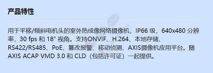 用于平移/倾斜电机头的室外热成像网络摄像机,IP66 级,640x480 分辨率,30 fps 和 18° 视角。支持ONVIF、H.264、本地存储、RS422/RS485、PoE、篡改报警、移动侦测、AXIS摄像机应用平台。随 AXIS ACAP VMD 3.0 和 CLD(包括许可证)一起提供。