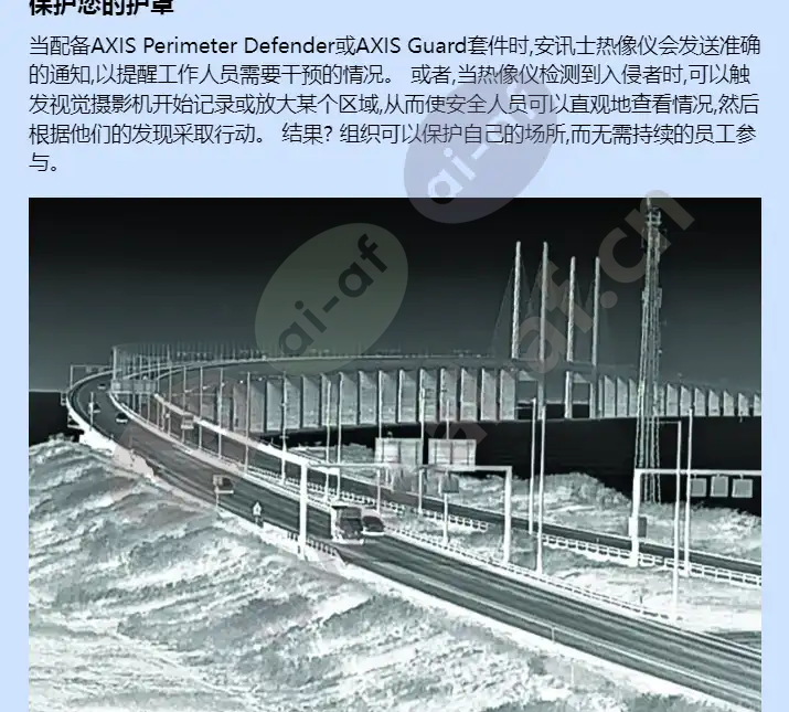 出色的检测和快速验证 高分辨率热成像 出色的图像对比度,更多细节 内置分析功能,可进行高质量检测 电子图像稳定 Axis Zipstream technology AXIS Q1942-E可让您在从漆黑到强烈阳光的各种条件下准确检测,及时验证并采取行动。 非常适合在紧急情况下进行监控。 热成像摄像机和分析:较好的合作伙伴 结合智能分析功能,热成像摄像机可在完全黑暗的环境中或在其他挑战性条件(例如烟尘)中检测人员,物体和事件。当热成像摄像机和分析仪一起使用时,热图像中的高对比度可确保更高的准确性:由于环境条件(例如光照变化,雨,雪,移动的植被,昆虫,反射和阴影),错误警报被保持在肯定最低的水平错误触发警报的可能性要小得多。 保护您的护罩 当配备AXIS Perimeter Defender或AXIS Guard套件时,安讯士热成像摄像机会发送准确的通知,以提醒工作人员需要干预的情况。 或者,当热成像摄像机检测到入侵者时,可以触发视觉摄影机开始记录或放大某个区域,从而使安全人员可以直观地查看情况,然后根据他们的发现采取行动。 结果? 组织可以保护自己的场所,而无需持续的员工参与。 远+宽+锐=准确 AXIS Q1942-E具有VGA 640x480热分辨率,可实现大范围覆盖和远距离:换句话说,一台摄像机可以捕获大范围远距离发生的事件。此外,得益于动态直方图均衡,增强的局部对比度和动态锐化的结合,AXIS Q1942-E可以在所有条件下提高清晰视频的图像对比度。 电子防抖 即使摄像机受到振动,也可以保持图像流畅。结果是出色的检测功能以及对检测到的事件的性质的快速便捷的视觉验证。您可以消除它们-或对它们执行某些操作-从而将错误警报保持在最低水平。 没有自动增益控制的热成像摄像机 带有自动增益控制的AXIS Q1942-E热成像网络摄像机 清晰的图像 热成像摄像机是与视频分析结合使用