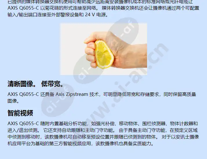 扩展的温度范围高达75°C(167°F) 符合 MIL-STD-810G HDTV 1080p 和 32 倍光学变焦 光纤或以太网连接 Zipstream 关键任务和大范围监控 AXIS Q6055-C PTZ 摄像机在沙漠等环境中提供高视频质量和性能,在此情况下较高的环境温度和太阳辐射要求摄像机在很热条件下运行。 凭借 HDTV 1080p 和 32 倍光学变焦以及自动对焦,户外专用的 PTZ 半球摄像机提供出色的大区域覆盖范围以及很好细节(放大时)。非常适合在施工场地和露天开采的矿场、沿着管道使用以及用于城市监控。 可在极为炎热的环境中可靠工作 凭借其内置的主动散热系统,AXIS Q6055-C 可在高达 75 °C (167 °F) 的温度下运行。 该防尘防水摄像机为 IP66 和 NEMA 4X 级并符合 MIL-STD-810G 标准,确保了在沙尘暴等恶劣天气条件下的可靠工作。 支持冲击侦测可让摄像机在遭到碰撞时触发警报。 以 HDTV 呈现良好细节 AXIS Q6055-C 具有一个较宽水平视角范围:62.8°–2.23°。 该摄像机的 32 倍光学变焦结合 HDTV 1080p 分辨率可提供极详细的放大视图,从而能够(例如)读取 300 米(984 英尺)开外处车辆的牌照。 AXIS Q6055-C 提供与 AXIS Q6055-E 相同的视频质量。 该摄像机专为全天候水平转动/垂直转动/变焦运行而设计。 它在每秒 450° 时做出快速精准的水平转动/垂直转动响应。 它可使用轮巡自动指向 256 个预设位置。 灵活的安装和轻松的集成 已提供的媒体转换器交换机使用可帮助减少远距离安装摄像机成本的标准网络或光纤电缆让 AXIS Q6055-C 以菊花链的形式连接至网络。 媒体转换器交换机还会让摄像机通过两个可配置输入/输出端口连接至外部警报设备和 24 V 电源