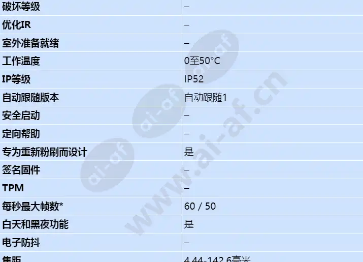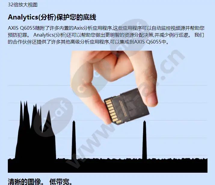 HDTV 1080p和32倍光学变焦 安讯士的Zipstream技术 内置视频分析 IP52等级的防尘和防滴水保护 对于苛刻的条件 AXIS Q6055是一款高级PTZ球型摄像机,可为您提供一览无余的概览和精湛的放大细节。 专为苛刻的条件而设计,是在机场,火车站,体育馆,购物中心,仓库和工厂进行监控的理想选择-任何需要快速,精确,全天候水平/垂直/缩放操作的地方。 亲密地起床 AXIS Q6055具有32倍光学变焦,结合HDTV 1080p分辨率,可提供感兴趣的人和物体的很好放大视图。 例如,您可以在100米(328英尺)外的人脸上看到表情。 广角,1倍变焦。 32倍放大视图 Analytics(分析)保护您的底线 AXIS Q6055随附了许多内置的Axis分析应用程序,这些应用程序可以自动监控视频源并帮助您预防犯罪。 Analytics(分析)还可以帮助您做出更明智的资源分配决策,并减少例行巡逻。 我们的合作伙伴还提供了许多其他高级分析应用程序,可以集成到AXIS Q6055中。 清晰的图像。 低带宽。 AXIS Q6055还采用了安讯士的Zipstream技术,该技术可显着降低带宽和存储要求,同时保留高质量图像。 安全101 安讯士网络摄像机可提供清晰的细节,以识别盗贼并协助当地安全提供商进行执法 图像传感器 CMOS 图像传感器大小 1/2.8 宽动态范围 宽动态 最低照度/感光度(彩色) 0.3 lux 最低照度/感光度(黑白) 0.03 lux 本地存储(内存卡插槽) 是 工作温度 0至50°C 防护等级 IP52 专为重新上漆而设计 是 自动跟随版本 自动跟随1 最大视频分辨率 1920x1080 每秒最大帧数* 60 / 50 日夜功能 是 焦距 4.44-142.6毫米 水平视场 62.8 - 2.23 ° 垂直视场 36.8 - 1.3 ° 平移范围