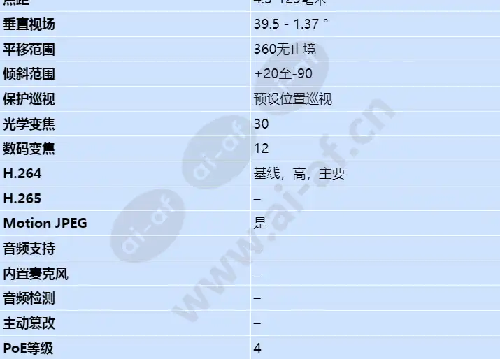 激光聚焦 速干安讯士Sharpdome技术 觅光者和WDR –查看捕获 Zipstream HDTV 1080p和30倍光学变焦 较好的即时对焦对于PTZ摄像机是一项挑战,尤其是在弱光条件下。 AXIS Q6155-E PTZ网络摄像机使用先进的激光技术,即使在黑暗中也始终可以提供较好的对焦。 该摄像机非常适合城市监控,关键基础设施和其他需要即时关注移动物体和快速变化场景的应用。 始终专注 AXIS Q6155-E的内置激光器使其成为市场上对焦速度非常快的PTZ摄像机。 在困难的环境下,例如低光照,低对比度或点状光照的场景,AXIS Q6155-E确实能脱颖而出。 其100%安全的激光束可在不到一秒的时间内测量摄像机与物体之间的距离,每次都能提供较好聚焦的图像。 总是有颜色 AXIS Q6155-E提供了安讯士的觅光者技术,该技术可在黑暗中“发现”光线,以提供出色的图像质量,低噪声和生动的色彩细节。 借助安讯士的Sharpdome,借助AXIS Q6155-E,您可以在地平线上方看到与地平线以下相同的清晰清晰图像质量。 我们的速干功能可确保在下雨天时获得清晰清晰的图像。 清晰的图像。 低带宽。 AXIS Q6155-E还具有安讯士的Zipstream技术,该技术可显着降低带宽和存储要求,同时保留高质量图像。 克罗地亚汽车俱乐部(HAK) 克罗地亚道路基础设施的关键区域由安讯士摄像机监控,可通过网站和移动应用程序为驾驶员提供交通信息 图像传感器 CMOS 图像传感器大小 1/2.8 觅光者 觅光者 宽动态范围 法医抓捕 最低照度/感光度(彩色) 0.15 lux 最低照度/感光度(黑白) 0.01 lux 本地存储(内存卡插槽) 是 工作温度 -55至50°C 室外准备就绪 是 防破坏等级 IK08 防护等级 IP66 专为重新上漆而设计 是 自动跟随版本 自动跟随1 最大视