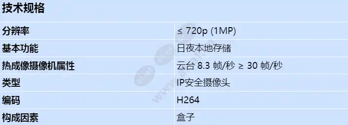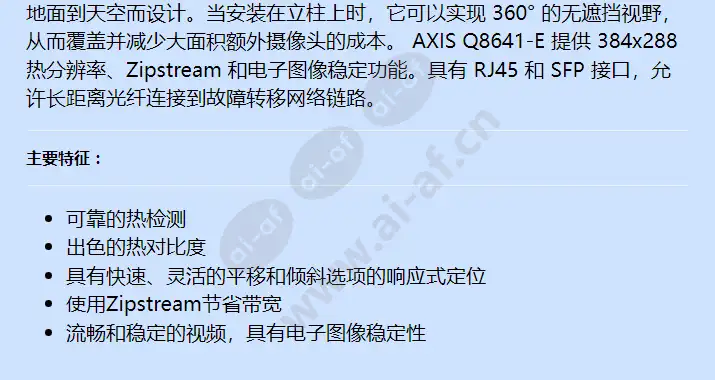 热云台摄像机 分辨率 348x288 固定镜头10.7° 适合远距离检测 远距离无遮挡观察和检测 AXIS Q8641-E PT 热成像网络摄像机提供出色的热对比度和 10° 视野,并为操作员提供分析、远距离检测和即时视觉确认。非常灵敏且可靠的定位摄像机,专为连续且无震动的平移和倾斜运动(360° 无限和 135° 远距离)地面到天空而设计。当安装在立柱上时,它可以实现 360° 的无遮挡视野,从而覆盖并减少大面积额外摄像机的成本。 AXIS Q8641-E 提供 384x288 热分辨率、Zipstream 和电子图像稳定功能。具有 RJ45 和 SFP 接口,允许长距离光纤连接到故障转移网络链路。 主要特征: 可靠的热检测 出色的热对比度 具有快速、灵活的平移和倾斜选项的响应式定位 使用Zipstream节省带宽 流畅和稳定的视频,具有电子图像稳定性 基本功能 日夜本地存储 分辨率 ≤ 720p (1MP) 编码 H264 热成像摄像机属性 云台 8.3 帧/秒 ≥ 30 帧/秒 类型 IP安全摄像头 外形规格 盒子