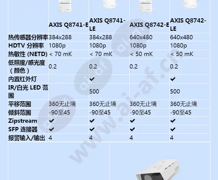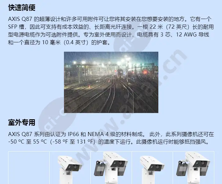 一个视图 - 两个双谱视频流 一个 IP 地址 侦测、验证和识别 360° 连续水平转动,以及从地面到天空 135° 转动 热成像变焦摄像机型号 安讯士定位摄像机可提供用于边界监控和其他有相似要求的应用中的单 PTZ 摄像机具有的视觉和热成像视频流所组成的强大且经济合算的组合。您只需一台摄像机和一个 IP 地址即可受益于远距离热成像侦测、视觉识别和 PTZ 功能。 敏捷平稳 AXIS Q87 双谱 PTZ 网络摄像机让操作员可以在极慢或超快水平转动(每秒从 0.05 到 120°)和垂直转动(每秒从 0.05 到 65°)之间进行选择。因此,当他们需要时可获得平稳无抖动全景视图,且可快速响应事件。通过热成像变焦摄像机型号(AXIS Q8742-E 变焦摄像机和 AXIS Q8742-LE 变焦摄像机),您可获得 3 倍热成像变焦,根据约翰逊准则,可让您侦测到 3 公里(3342 码)外的人。请访问产品页以了解详细信息。远距离侦测可用于任务关键型使用,例如远距离侦测车辆或入侵者。可将摄像机安装在柱形物、立杆或墙壁上以获得 360° 全景视图以及从 -90° 至 +45° 的地面到天空视图。当它们运行时能够抵挡强风。 快速简便 AXIS Q87 的超薄设计和许多可用附件可让您将其安装在您想要安装的地方。它有一个 SFP 槽,因此可支持有成本效益的、长距离光纤连接。一根 22 米(72 英尺)长的耐用型电源电缆作为可选附件提供。专为室外使用而设计,电缆具有 3 芯、12 AWG 导线和一个直径为 10 毫米(0.4 英寸)的护套。 室外专用 AXIS Q87 系列由认证为 IP66 和 NEMA 4 级的材料制成。 此外,此系列摄像机还可在 -50 ºC 至 55 ºC(-58 ºF 至 131 ºF)的温度下运行。此摄像机运行时能够抵挡强风。 AXIS Q8741-E