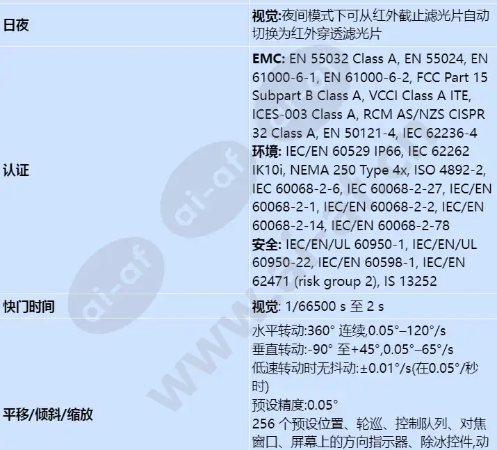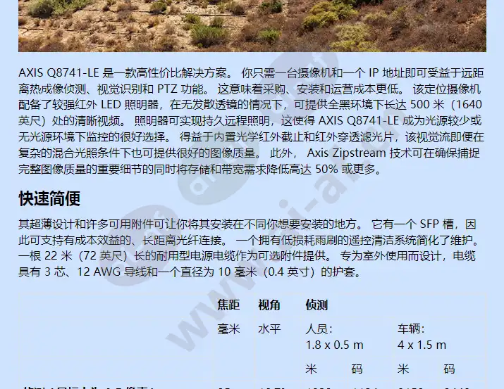 一个视图 - 两个双谱视频流 借助红外照明实现可靠侦测、迅速核实和识别 定位灵敏,可实现 360° 连续水平转动,以及从地面到天空 135° 转动 使用一个 IP 地址就可轻松进行安装 长距离网络连接 AXIS Q8741-LE Network Camera 是一款定位摄像机,它将强大而经济实惠的视觉和热成像视频流融于一台 PTZ 摄像机中,扩展了具有类似要求的监控和其他应用。 AXIS Q8741-LE 具备针对视觉流的红外照明功能和内置光学红外滤光片,因此,即使在全黑或复杂的混合光照条件下也不会被影响。 成功的组合 AXIS Q8741-LE 将两台出色摄像机的功能融于一体: 这款热成像摄像机采用分辨率为 384x288 的很好对比度,在不同天气和光线条件下都能实现全天候可靠侦测和验证。 这是一款具有超高感光度的视觉摄像机,采用 HDTV 1080p 分辨率和集成的 30 倍光学变焦,可用于识别目的。 此款视觉摄像机还支持宽动态范围 – Forensic Capture,可清晰呈现同时具有黑暗和明亮区域的场景中的细节。 而且对焦唤醒功能可实现你所定义区域中的即时对焦。 敏捷、平稳的 360° 覆盖区域 AXIS Q8741-LE 让操作员可以在极慢或超快水平转动(每秒从 0.05 到 120°)和垂直转动(每秒从 0.05 到 65°)之间进行选择。 因此,当他们需要时可获得平稳无抖动全景视图,且可快速响应事件。 可将摄像机安装在柱形物、立杆或墙壁上以获得 360° 全景视图以及从 -90° 至 +45° 的地面到天空视图。 当它静止时能够抵挡强风,当它运动时能够抵挡高达 40 米每秒 (90 mph) 的大风。 而且它有一个 SFP 槽,因此可支持长距离光纤连接。 单设备节省 AXIS Q8741-LE 是一款高性价比解决方案。 你只需一台摄像机和一个 IP 地址即可