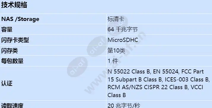 AXIS 监控卡 64 GB 是一种高耐用性 microSDXC™ 卡,针对视频监控进行了优化。它支持使用安讯士摄像机进行健康状态监控。该卡通过分散式视频录制实现灵活的边缘录制解决方案,无需现场服务器、DVR 或 NVR。优化带宽使用,因为即使带宽有限或不存在,视频也会记录在每台摄像机上。与安讯士 Zipstream 技术相结合,即使是高质量的视频或更长的保留时间也能得到有效利用。包括 SD 卡适配器。 主要特征: 针对监控摄像机进行了优化 与具有边缘存储功能的安讯士产品兼容 Axis three-year warranty NAS /Storage 标清卡 容量 64 千兆字节 闪存卡类型 MicroSDHC 闪存类 第10类 读取速度 20 兆字节/秒 写入速度 20 兆字节/秒 工作温度 (T-T) -25 - 85 °C 储存温度 (T-T) -40 - 85 °C 宽度 15 mm 深度 1 mm 身高 11 mm 包括内存适配器 SD 每包数量 1 件 包装类型 珠宝盒 标清适配器尺寸(宽x深x高) 24 x 32 x 2.1 mm 产品颜色 白色 认证 N 55022 Class B, EN 55024, FCC Part 15 Subpart B Class B, ICES-003 Class B, RCM AS/NZS CISPR 22 Class B, VCCI Class B