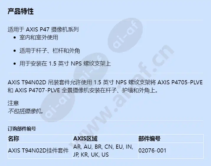 适用于 AXIS P47 摄像机系列 室内和室外使用 适用于杆子、栏杆和外角 用于安装在 1.5 英寸 NPS 螺纹支架上 AXIS T94N02D 吊装套件允许使用 1.5 英寸 NPS 螺纹支架将 AXIS P4705-PLVE 和 AXIS P4707-PLVE 全景摄像机安装在杆子、护墙和外角上。 注意 不包括摄像机。 订购部件编号 名称 Axis region 部件编号 AXIS T94N02D挂件套件 AR, AU, BR, CN, EU, IN, JP, KR, UK, US 02076-001 安装支架 吊坠