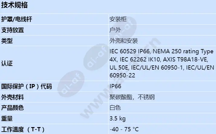 防破坏 与AXIS P54系列兼容 易于安装 为安讯士摄像机定制设计 兼容(包括摄像机注释) AXIS P54 Series 兼容产品 PTZ摄像机 AXIS P5414-E AXIS P5415-E 护罩/电线杆 安装柜 类型 外壳和安装 支持放置 户外 产品颜色 白色 外壳材料 聚碳酸酯,不锈钢 国际保护(IP)代码 IP66 认证 IEC 60529 IP66, NEMA 250 rating Type 4X, IEC 62262 IK10, AXIS T98A18-VE, UL 50E, IEC/UL/EN 60950-1, IEC/UL/EN 60950-22 重量 3.5 kg 工作温度 (T-T) -40 - 75 °C