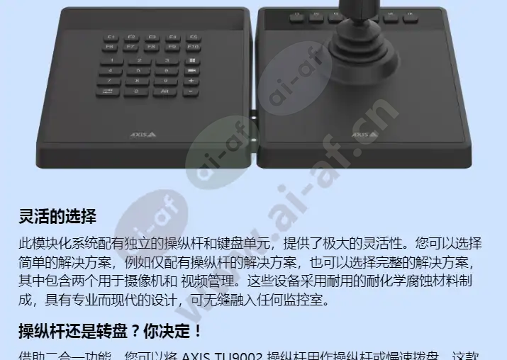 用于专业的摄像机和视频管理 模块化系统 高耐久性 专业且现代的设计 可配置 LCD 显示屏 易于安装 灵活的选择 此模块化系统配有独立的操纵杆和键盘单元,提供了极大的灵活性。您可以选择简单的解决方案,例如仅配有操纵杆的解决方案,也可以选择完整的解决方案,其中包含两个用于摄像机和 视频管理 。这些设备采用耐用的耐化学腐蚀材料制成,具有专业而现代的设计,可无缝融入任何监控室。 操纵杆还是转盘?你决定! 借助二合一功能,您可以将 AXIS TU9002 操纵杆用作操纵杆或慢速拨盘。这款 3 Axis操纵杆配有旋钮和 8 个应用程序定义的热键。此外,切换键可让您轻松在不同的应用程序之间切换,例如操纵杆和慢速拨盘模式。您可以轻松浏览录制的视频或准确、灵敏地控制 PTZ 摄像机。此外,您还可以将此操纵杆用作计算机鼠标。 操作、安装简便 我们的键盘 AXIS TU9003 可让您在 AXIS Camera Station Pro 或其他兼容设备中的工作区、摄像机、视图和 PTZ 预设之间快速切换 视频管理软件(VMS) 。它有一个 LCD 显示屏,可以通过 VMS 进行控制。此外,金属支架可让您轻松连接键盘和操纵杆,因此它们感觉更像是一个统一的控制板。这些设备专为左手和右手使用而设计,可通过 USB 接口轻松安装。完整的 AXIS TU9001 将两个模块与充当 USB 集线器的操纵杆互连。 订购部件编号 名称 Axis region 部件编号 AXIS TU9001 控制板 AR, AU, BR, CN, EU, IN, JP, KR, UK, US 02474-001