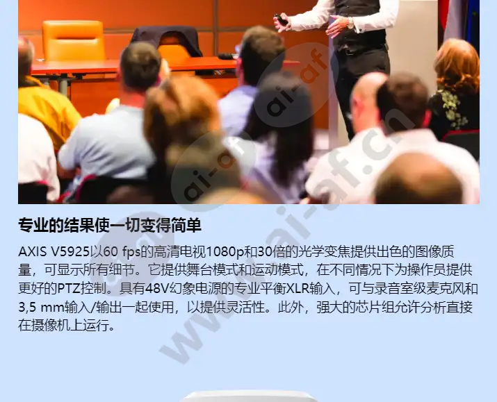 广播级高清电视1080p PTZ摄像机 AXIS V5925 PTZ网络摄像机 具有XLR输入的录音棚级音频 支持IP的VISCA和VISCA 包括Camstreamer 3个月试用版 3G-SDI和HDMI输出 AXIS V5925非常适合用于礼堂,教室,室内运动赛事和礼拜场所,可提供出色的视频质量和演播室级音频,用于专业广播和实时流媒体。 专业的结果使一切变得简单 AXIS V5925以60 fps的高清电视1080p和30倍的光学变焦提供出色的图像质量,可显示所有细节。它提供舞台模式和运动模式,在不同情况下为操作员提供更好的PTZ控制。具有48V幻象电源的专业平衡XLR输入,可与录音室级麦克风和3,5 mm输入/输出一起使用,以提供灵活性。此外,强大的芯片组允许分析直接在摄像机上运行。 兼容性强 这款用途广泛的 PTZ 摄像机包括 HDMI 和 3G-SDI 输出,可让您连接到大多数专业视频切换器。借助基于 VISCA RS-232 的控制系统,摄像机可轻松与您现有的 AV 安装集成。此外,VISCA over IP 允许通过 LAN 连接远程控制多台摄像机。此外,对于简单或移动安装,随附的 3 个月 Camstreamer 试用许可证可让您通过 IP 网络直接从摄像机向 YouTube 和 Facebook Live 等流媒体平台进行直播。您还可以使用任何主要 视频管理 软件或者直接通过网络浏览器连接。 较低的带宽和增强的安全性 AXIS V5925 具有 Axis Zipstream 采用 H.264 和 H.265 技术保留所有重要细节,同时显着降低带宽和存储要求。它包含高级安全功能,可防止未经授权的访问并保护您的系统。签名固件和 安全启动 保证固件没有被破坏,并确保只安装授权固件。如果需要,安全启动可确保摄像机在出厂默认设置后完全没有恶意软件。 订购部件编号