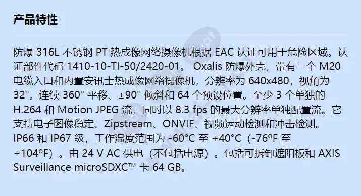 防爆 316L 不锈钢 PT 热成像网络摄像机根据 EAC 认证可用于危险区域。认证部件代码 1410-10-TI-50/2420-01。 Oxalis 防爆外壳,带有一个 M20 电缆入口和内置安讯士热成像网络摄像机,分辨率为 640x480,视角为 32°。连续 360° 平移、±90° 倾斜和 64 个预设位置。至少 3 个单独的 H.264 和 Motion JPEG 流,同时以 8.3 fps 的最大分辨率单独配置流。它支持电子图像稳定、Zipstream、ONVIF、视频运动检测和冲击检测。 IP66 和 IP67 级,工作温度范围为 -60°C 至 +40°C(-76ºF 至 +104ºF)。由 24 V AC 供电(不包括电源)。包括可拆卸遮阳板和 AXIS Surveillance microSDXC™ 卡 64 GB。