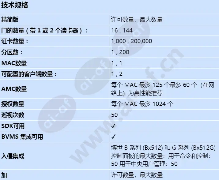 独立部署,带有自己的地图查看器,或作为 BVMS 的一个组成部分 结合高端 Access Engine 功能、性能和可用性,安装简单 使用三个许可包进行简单许可:Lite、Plus 和 Professional 用于与第三方应用程序集成的 API 支持最新、安全的操作系统:Windows Server 2016、Windows 10 和 SQL Server 2017 精简版 许可数量,最大数量 门的数量(带 1 或 2 个读卡器): 16 , 144 证卡数量: 1,000 , 200,000 分区数: 1 , 200 可配置的客户端数量: 1 , 2 MAC数量 1 , 1 AMC数量 每个 MAC 最多 125 个最多 60 个(在网络上)为高性能推荐 授权数量 每个 MAC 最多 1024 个 巡视次数 50 SDK可用 ✔ BVMS 集成可用 ✔ 入侵集成 博世 B 系列 (Bx512) 和 G 系列 (Bx512G) 控制面板的最大数量:用于命令和控制:50 用于中央用户管理:50 加 许可数量,最大数量