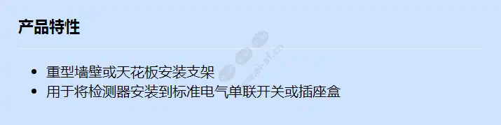 重型墙壁或天花板安装支架 用于将检测器安装到标准电气单联开关或插座盒 重量 0.89 千克(1.0 磅) 位置 水平调整、垂直调整 墙 ± 90°, + 5° 至 -15° 天花板 360°, + 5° 至 -15°