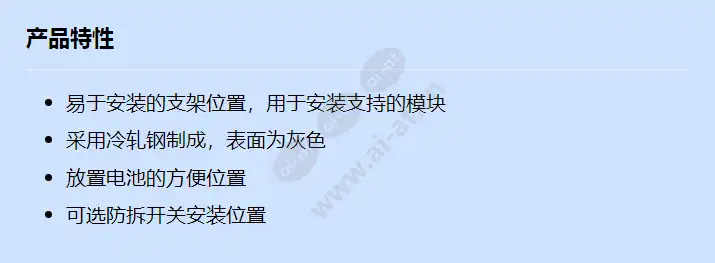 易于安装的支架位置,用于安装支持的模块 采用冷轧钢制成,表面为灰色 放置电池的方便位置 可选防拆开关安装位置 颜色 灰色的 尺寸(高 x 宽 x 深)(毫米) 410 x 410 x 90 mm 材料 钢 重量(千克) 4.50 kg
