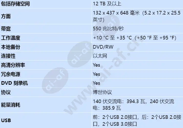 DIP-61F8-16HD 系列是一种经济实惠、简单且可靠的一体化录像管理解决方案,适用于网络监控系统。 它作为 Bosch 视频录制解决方案的预配置存储阵列发货,尚未安装 Video Recording Manager 软件。 一旦从博世产品目录下载软件并将其安装在 DIP-61F8-16HD 上,它将以预许可的 64 通道开始,并可升级至 128 通道。 它由博世的 Video Recording Manager 软件提供支持,是一种智能 IP 存储设备,无需单独的 NVR(网络视频录像机)服务器和存储硬件,可将总拥有成本降低多达 45%。 它是一个 3HU 机架安装单元,将先进的录音管理和很先进的 iSCSI 存储结合到一个经济高效的即插即用 IP 录音设备中,适用于寻求很先进的 IT 客户。 艺术“二代”NVR录像解决方案。 RAID-5保护(标配),最多128路一体化录音解决方案 预装、预配置IP存储方案,存储容量高达128TB 热插拔硬盘 通过桌面应用程序、浏览器或 SNMP 进行远程监控 技术 数字-IP 不。 IP通道 64 高清/百万像素录制 Yes 第 3 方 IP 设备 支持的 可插拔硬盘 Yes RAID保护 包括 外置储存 不支持 包括存储空间 12 TB 及以上 本地备份 DVD/RW 连接性 以太网 工作温度 +10 °C 至 +35 °C(+50 °F 至 +95 °F) IP通道 64个通道 硬盘大小 128TB 协议 博世协议 特征 音频、DVD 刻录机、高清分辨率、冗余电源 记忆 8 GB 带宽 550 兆比特/秒 方面 132 x 437 x 648 毫米(5.2 x 17.2 x 25.5 英寸) 电压 100 至 240 伏 能量消耗 140 伏交流电:394.3 瓦,240 伏交流电:385.9 瓦 USB 前:2个USB