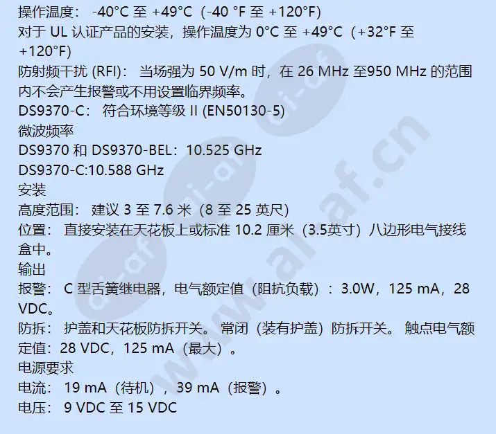 博世BOSCH DS9370 系列全方位三技术探测器 说明:三技术(微波/红外/人工智能) 探测范围:360度x70呎 (21米)直径 主要功能: DS9370 系列的每款三技术(TriTech®) 被动红外/微波探测器型号均为全方位探测器,它们采用多种专利处理技术,拥 有很好的捕获性能并消除了误报。 每种型号均可以安装在高 度达 7.6 米(25 英尺)的天花板上。 安装高度可达 7.6 米(25 英尺) 光学镜头可灵活调节,确保完全覆盖,并可定制探测范围 分离式外壳和底板,便于安装 高效 LED 指示灯和光管系统,方便步测 一步探测技术 (FSP) 产品参数 外壳设计 设计: 模块化底座和分体式安装底座让用户可以方便地现场设置、安装布线和维护。 尺寸: 8.9 x 17.8 厘米(3.5 英寸 x 7 英寸) 材料: 高强度 ABS 塑料外壳 环境要求 操作温度: -40°C 至 +49°C(-40 °F 至 +120°F) 对于 UL 认证产品的安装,操作温度为 0°C 至 +49°C(+32°F 至 +120°F) 防射频干扰 (RFI): 当场强为 50 V/m 时,在 26 MHz 至950 MHz 的范围内不会产生报警或不用设置临界频率。 DS9370-C: 符合环境等级 II (EN50130-5) 微波频率 DS9370 和 DS9370-BEL:10.525 GHz DS9370-C:10.588 GHz 安装 高度范围: 建议 3 至 7.6 米(8 至 25 英尺) 位置: 直接安装在天花板上或标准 10.2 厘米(3.5英寸)八边形电气接线盒中。 输出 报警: C 型舌簧继电器,电气额定值(阻抗负载):3.0W,125 mA,28 VDC。 防拆: 护盖和天花板防拆开关。 常闭(装有护盖)防拆开关。 触点电气额定值:28 VDC,125 mA(最大