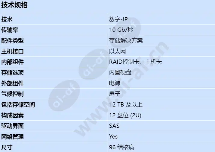 DSX-N1D6X8-12AT 代表下一代 DSA E? 系列,博世基于 iSCSI 的数字视频磁盘阵列。 它们是很先进的平台,专为安全行业要求最严苛的数字视频存储应用而设计,可管理不断增长的数字视频数据。 自高清和最近的超高清 (4K) IP 摄像机和编码器进入监控市场以来,对存储基础设施的高带宽和低复杂性不断增长的需求是主要挑战。 带 12 个内置 HDD 的 SAS 接口连接扩展单元 可配置的基于硬件的 RAID 保护(RAID?5 或 RAID?6)以获得最高的系统性能 冗余的热插拔电源设备和冷却风扇 全模块化设计,易于服务并受到 NetApp 服务的保护,包括 3 年的下一工作日现场支持 技术 数字-IP 配件类型 存储解决方案 内部组件 RAID控制卡、主机卡 外部组件 电源 存储选项 内置硬盘 包括存储空间 12 TB 及以上 主机接口 以太网 驱动界面 SAS 构成因素 12 盘位 (2U) 网络管理 Yes 气候控制 扇子 尺寸 96 结核病 传输率 10 Gb/秒