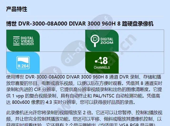 博世 DVR-3000-08A000 DIVAR 3000 960H 8 路硬盘录像机 使用博世 DVR-3000-08A000 DIVAR 3000 960H 8 通道 DVR 录制、存储和播放您喜爱的节目、电影或音乐视频,以便以后在方便时观看。凭借其 8 通道实时录制和先进的 CIF 分辨率,它提供高分辨率视频录制和出色的图像清晰度。它提供 1 vpp 的复合视频录制,具有自动终止和 PAL/NTSC 自动检测功能。凭借高达 800x600 像素的 4:3 实时分辨率,您可以获得很好品质的录音。 此录像机还允许您将录制的视频缩放至 2 倍。它还可以让您暂停、控制和播放视频,并让您完全控制其播放功能。您还可以平移、倾斜或缩放其摄像机控制,以获得实时观看体验。它还具有 2 个显示器输出(均适用于 VGA RGB 显示器),因此可以灵活查看。该录像机能够传输压缩至 H264 的视频。 Bosch DVR-3000-08A000 DIVAR 3000 960H 8ch DVR 还配备了外部交流/直流电源适配器。 博世 DVR-3000-08A000 DIVAR 3000 960H 8 通道 DVR 的主要特性 记录实时视频和节目以供以后观看:它提供远程观看和播放控制 不含硬盘 观看灵活:具有2路监视器输出,观看灵活 高清录制:8路实时录制,CIF分辨率,视频质量很好 2 倍光学变焦:通过 2 倍光学变焦,您可以暂停、播放或缩放录制的视频 > 替换: DVR-670-08A000 通道容量: 8 通道 硬盘端口: 4个SATA端口 Pre-Installed Storage: 不含硬盘 产品系列: 博世 DIVAR 3000 系列 记录技术: 数字录像机(DVR) Warranty: 3 年制造商保修