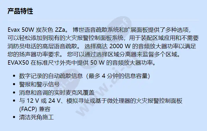 Evax 50W 炭灰色 2Za。 博世语音疏散系统和扩展面板提供了多种选项,可以轻松添加到现有的火灾报警控制面板系统,用于装配区域应用和不需要消防员电话的高层语音疏散。 选择高达 2000 W 的音频放大器功率以满足您的扬声器功率要求。 您可以通过选择区域分离器来监督多个区域。 EVAX50 在标准尺寸外壳中提供 50 W 的音频放大器功率。 数字记录的自动疏散信息(最多 4 分钟的信息容量) 警报和警示信号 消息和音调的实时麦克风覆盖 与 12 V 或 24 V、模拟寻址或基于微处理器的火灾报警控制面板 (FACP) 兼容 清洁死角施工 家庭控制 Wi-Fi 报警输入输出 2/2