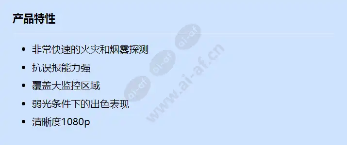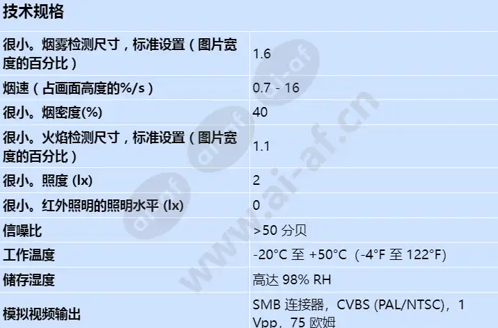 非常快速的火灾和烟雾探测 抗误报能力强 覆盖大监控区域 弱光条件下的出色表现 清晰度1080p 很小。烟雾检测尺寸,标准设置(图片宽度的百分比) 1.6 烟速(占画面高度的%/s) 0.7 - 16 很小。烟密度(%) 40 很小。火焰检测尺寸,标准设置(图片宽度的百分比) 1.1 很小。照度 (lx) 2 很小。红外照明的照明水平 (lx) 0 标准 G.711, 8 kHz 采样率 L16, 16 kHz 采样率 AAC-LC, 48 kbps at 16 kHz 采样率 AAC-LC, 80 kbps at 16 kHz 采样率 信噪比 >50 分贝 音频流 全双工/半双工 工作温度 -20°C 至 +50°C(-4°F 至 122°F) 储存温度 -30°C 至 +70°C(-22°F 至 +158°F) 工作湿度 20% 至 93% 相对湿度 储存湿度 高达 98% RH 模拟视频输出 SMB 连接器,CVBS (PAL/NTSC),1 Vpp,75 欧姆 音频线路输入 1 Vrms 最大值,18 kOhm 典型值, 音频线路输出 0.85 Vrms,典型值为 1.5 kOhm, 音频接口 3.5 毫米单声道插孔 报警输入 2 路输入 报警输入激活 +5 VDC 标称; +40 VDC 最大值(直流耦合 50 kOhm 上拉电阻至 +3.3 VDC)(< 0.5 V 为低;> 1.4 V 为高) 报警输出 1 路输出