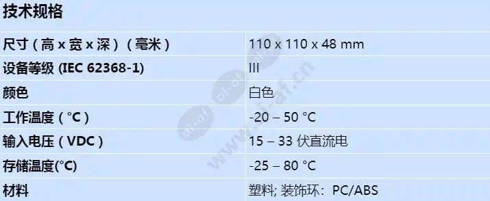 自动或手动地址设置的旋转开关 换极控制信号装置线路 通过 FLM-420-NAC 信号设备接口模块同步激活连接到 LSN 模块的所有信号设备 通过LSN可选择10种不同的输出信号 由于两个集成隔离器,在线路中断或短路的情况下保持 LSN 回路功能 带 DIN 导轨适配器 设备等级 (IEC 62368-1) III 颜色 白色 尺寸(高 x 宽 x 深)(毫米) 110 x 110 x 48 mm 输入电压(VDC) 15 – 33 伏直流电 材料 塑料; 装饰环:PC/ABS 工作温度(°C) -20 – 50 °C 存储温度(°C) -25 – 80 °C
