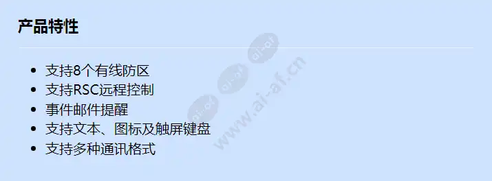 支持8个有线防区 支持RSC远程控制 事件邮件提醒 支持文本、图标及触屏键盘 支持多种通讯格式 主电源: 220 VAC, 18 VAC (1.47 A时) 备用电源: 12 VDC, 7Ah的密封铅酸充电电池 电流消耗(待机) 65 mA 电流消耗(报警) 115 mA 电流消耗(报警/带键盘) 105 mA 相对湿度: 20% ~ 90% (无霜) 工作温度: 0°C ~ +50°C 尺寸(含外壳): 336 毫米 x 268 毫米 x 90 毫米 重量: 3.2 公斤