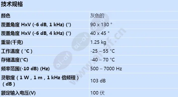 高效驱动力 大开口角度 出色的语音再现 简单的电源设置 防水防尘 IP 65 多功能安装支架 符合国际安装和安全法规 颜色 灰色的 覆盖角度 HxV (-6 dB, 1 kHz) (°) 90 x 130 ° 覆盖角度 HxV (-6 dB, 4 kHz) (°) 40 x 45 ° 频率范围(-10 dB) (Hz) 500 – 7000 Hz 工作温度(°C) -25 – 55 °C 额定输入电压(V) 100 伏 灵敏度(1 W,1 m,1 kHz 倍频程)(dB) 103 dB 存储温度(°C) -40 – 70 °C 重量(千克) 1.25 kg