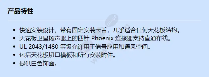 快速安装设计,带有固定安装卡舌,几乎适合任何天花板结构。 天花板卫星扬声器上的四针 Phoenix 连接器支持直通布线。 UL 2043/1480 等级允许用于信号应用和通风空间。 包括天花板切口模板和所有安装附件。 提供白色饰面。 颜色 白色 频率范围(-10 dB) (Hz) 180 – 20000 Hz 材料 钢 最大功率(W) 30 瓦 标称阻抗(Ω) 16 Ω 工作温度(°C) -25 – 55 °C 工作温度 (°F) -13 – 131 °F 存储温度(°C) -40 – 70 °C 存储温度(°F) -40 – 158 °F 重量(克) 820 g 重量(磅) 1.80 lb