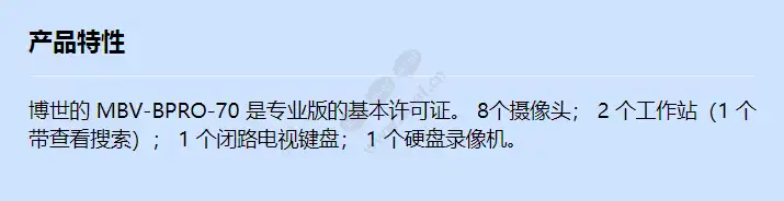 博世的 MBV-BPRO-70 是专业版的基本许可证。 8个摄像头; 2 个工作站(1 个带查看搜索); 1 个闭路电视键盘; 1 个硬盘录像机。