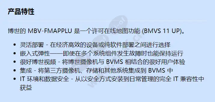 博世的 MBV-FMAPPLU 是一个许可在线地图功能 (BMVS 11 UP)。 灵活部署 - 在经济高效的设备或纯软件部署之间进行选择 嵌入式弹性——即使在多个系统组件发生故障时也能保持运行 很好博世视频 - 将博世摄像机与 BVMS 相结合的很好用户体验 集成 - 将第三方摄像机、存储和其他系统集成到 BVMS 中 IT 环境和数据安全 - 从以安全方式安装到日常管理的完全 IT 兼容性中获益
