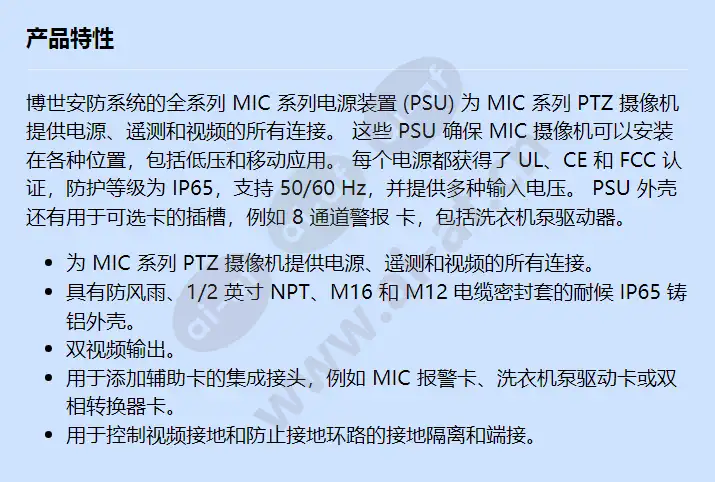 博世安防系统的全系列 MIC 系列电源装置 (PSU) 为 MIC 系列 PTZ 摄像机提供电源、遥测和视频的所有连接。 这些 PSU 确保 MIC 摄像机可以安装在各种位置,包括低压和移动应用。 每个电源都获得了 UL、CE 和 FCC 认证,防护等级为 IP65,支持 50/60 Hz,并提供多种输入电压。 PSU 外壳还有用于可选卡的插槽,例如 8 通道警报 卡,包括洗衣机泵驱动器。 为 MIC 系列 PTZ 摄像机提供电源、遥测和视频的所有连接。 具有防风雨、1/2 英寸 NPT、M16 和 M12 电缆密封套的耐候 IP65 铸铝外壳。 双视频输出。 用于添加辅助卡的集成接头,例如 MIC 报警卡、洗衣机泵驱动卡或双相转换器卡。 用于控制视频接地和防止接地环路的接地隔离和端接。 电源类型 防风雨 输出数量 2 输入电压 24 伏交流 输出电压 18 VAC 特征 接地电源线,隔离输出,UL 认证 输出保护 保险丝 输出数量 2 电源选项 18VAC 输出类型 交流 认证 CE、UL
