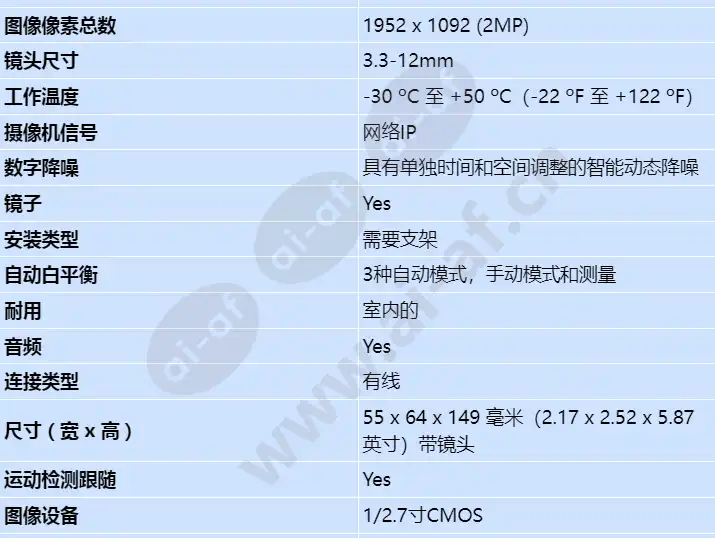 时尚的室内网络摄像机 清晰图像的 720p 分辨率 智能动态降噪可将带宽和存储需求降低高达 50% 用于本地录像的 SD 卡插槽 FTP、Dropbox 和电子邮件警报 特征 自动增益控制、自动白平衡、背光补偿、日/夜、数字降噪、运动检测跟随、ONVIF、隐私遮蔽、宽动态范围 信噪比 > 50 分贝 协议 IPv4, IPv6, UDP, TCP, HTTP, HTTPS, RTP/RTCP, IGMP V2/V3, ICMP, ICMPv6, RTSP, FTP, Telnet, ARP, DHCP, NTP (SNTP), SNMP (V1, MIB-II), 802.1x、DNS、DNSv6、DDNS(DynDNS.org、selfHOST.de、noip.com)、SMTP、iSCSI、UPnP (SSDP)、DiffServ (QoS)、LLDP、SOAP、Dropbox 隐私区 四个独立区域,完全可编程 能量消耗 3.2 瓦 工作温度 -30 ºC 至 +50 ºC(-22 ºF 至 +122 ºF) 工作湿度 0% 至 90% 相对湿度(非冷凝) 很小场景照度 彩色 0.25 lx,单色 0.05 lx 镜头尺寸 3.3-12mm 摄像机信号 网络IP 镜头类型 Varifocal 视角 广角:110º x 58º(水平 x 垂直),长焦:34º x 18º(水平 x 垂直) 数字降噪 具有单独时间和空间调整的智能动态降噪 视频输出 CVBS、1 Vpp、2.5 毫米插孔、75 欧姆可选标准 背光补偿 On/off 自动白平衡 3种自动模式,手动模式和测量 红外距离 非红外线 分辨率 1 百万像素 电压 PoE 压缩方法 H.264、M-JPEG、JPEG 连接类型 有线 图像像素总数 1952 x 1092 (2MP) 图像设备 1/2.7寸CMOS 电子快