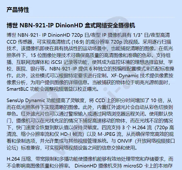 博世 NBN-921-IP DinionHD 盒式网络安全摄像机 博世 NBN-921- IP DinionHD 720p 日/夜型 IP 摄像机具有 1/3" 日/夜型高清 CCD 传感器,可实现高清格式 (16:9) 的高分辨率 720p 流视频。采用逐行扫描技术,该摄像机即使在具有挑战性的运动场景中,也能捕捉清晰的图像。在低光照条件下,15 位图像处理技术可确保高质量的高清图像和准确的色彩。支持组播、互联网流媒体和 iSCSI 记录等功能,使其成为监控环境的理想选择监狱、学校、医院、银行等。NBN-921-IP 提供 6 种独立的预编程配置模式来匹配标准操作。此外,这些模式可以根据特定要求进行定制。XF-Dynamic 技术提供像素按像素分析,为用户提供图像的详细信息。当被捕获的物体位于明亮光源前面时,SmartBLC 功能会调整视频增益以校正曝光。 SensUp Dynamic 功能提高了灵敏度,将 CCD 上的积分时间增加了 10 倍,从而在低光照条件下实现清晰的图像。此外,内置红外滤光片会自动从彩色切换到单色。红外滤光片也可以通过警报输入或通过网络浏览器远程关闭。使用默认快门,摄像机可以在光线充足的情况下捕捉高速移动的物体,而在光线不足的情况下,快门速度会恢复到默认值以保持灵敏度。四流支持 3 个 H.264 流(720p 高清流、缩小分辨率流和仅 HD-I 帧流)以及 M-JPEG 流,从而确保带宽高效的观看和录制选项,并允许集成与其他视频管理系统。与 ONVIF(开放网络视频接口论坛)标准兼容,可实现网络视频设备之间的信息交换和使用。 H.264 压缩、带宽限制和多播功能使摄像机能够有效地处理带宽和存储要求,而不会影响高图像质量和分辨率。 DinionHD 摄像机支持 microSD 卡上的本地存储,可用于本地报警录制或自动网络补充 (ANR),以确保无差错