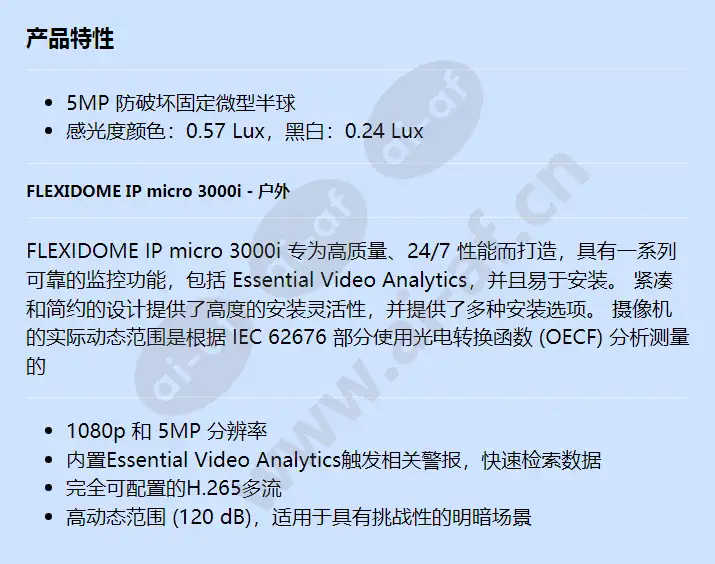 5MP 防破坏固定微型半球 感光度颜色:0.57 Lux,黑白:0.24 Lux FLEXIDOME IP micro 3000i - 户外 FLEXIDOME IP micro 3000i 专为高质量、24/7 性能而打造,具有一系列可靠的监控功能,包括 Essential Video Analytics,并且易于安装。 紧凑和简约的设计提供了高度的安装灵活性,并提供了多种安装选项。 摄像机的实际动态范围是根据 IEC 62676 部分使用光电转换函数 (OECF) 分析测量的 1080p 和 5MP 分辨率 内置Essential Video Analytics触发相关警报,快速检索数据 完全可配置的H.265多流 高动态范围 (120 dB),适用于具有挑战性的明暗场景 基本功能 昼夜本地存储 分辨率 5MP - 7MP 软件 Analytics 视角 91° - 100° 编码 H265