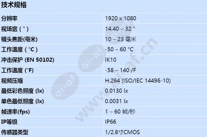 使用项目助手应用程序进行无线或远程配置和调试。平移、倾斜、滚动和缩放 (PTRZ) 可将摄像机设置为所需的视野,而无需触摸摄像机或镜头 星光技术可在极低光照条件下提供高度详细的图像 高动态范围可查看场景明亮和黑暗区域的每个细节 内置智能视频分析功能,具有对象检测功能,可触发警报并以高级别的可靠性快速检索数据 Camera Trainer 训练摄像机识别用户指定的移动和非移动物体的目标物体 视场宽(°) 14.40 – 32 ° 帧速率(fps) 1 – 60 帧/秒 冲击保护 (EN 50102) IK10 IP等级 IP66 镜头焦距(毫米) 10 – 23 毫米 最低彩色照度 (lx) 0.0130 lx 单色最低照度 (lx) 0.0031 lx 工作温度(°C) -50 – 60 °C 工作温度 (°F) -58 – 140 /F 分辨率 1920 x 1080 传感器类型 1/2.8寸CMOS 视频压缩 H.264 (ISO/IEC 14496-10)