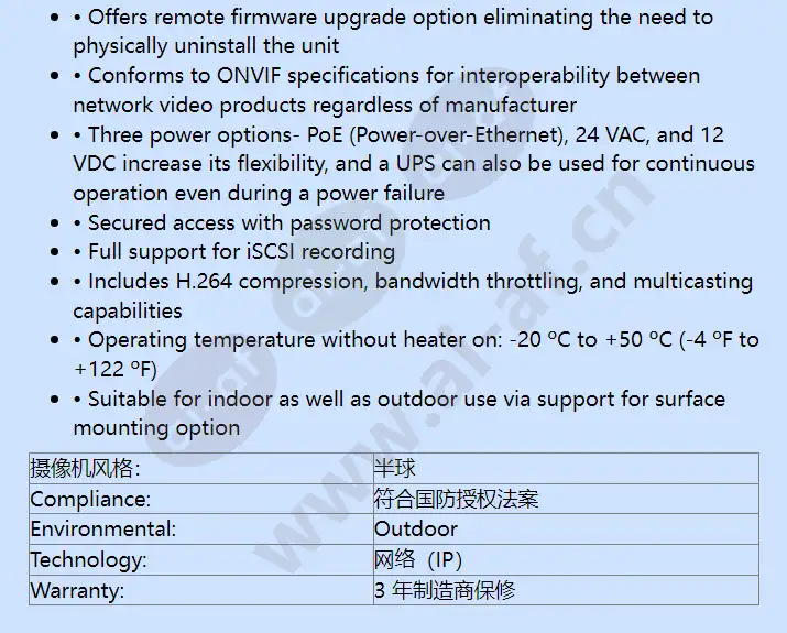 博世 FlexiDome2X NDN-498V03-21PS H.264 防破坏安全摄像机 博世 NDN-498V03-21PS 是博世安全摄像机的精英系列之一。博世安防摄像机拥有行业率先的质量和性能。博世安全摄像机具有很好的功能,使其成为任何视频监控系统的解决方案。以下是博世 NDN-498V03-21PS 的主要功能。 主要特征: • Vandal-resistant, network dome camera suitable for day night operation • 1/3" progressive scan CCD offers reduced motion blur • 2.8-10mm varifocal lens for variable field of coverage • 20-bit digital signal and image processing reveal details in video image • Automatically switches modes for day/night operation • NightSense feature along with SensUp dynamic increases the FlexiDome2X Day/Night IP camera's sensitivity to view in up to 0.0099 lux in monochrome • 2X-Dynamic engine reproduces images with wide dynamic range • SmartBLC feature improves backlit images • Offers Autoblack feature for low-contrast scenes •