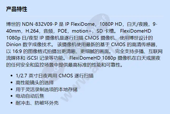 博世 Bosch NDN-832V09-P 1/2.7 英寸 CMOS 日夜高清摄像机 1080P 9-40mm IP66 F.01U.170.539