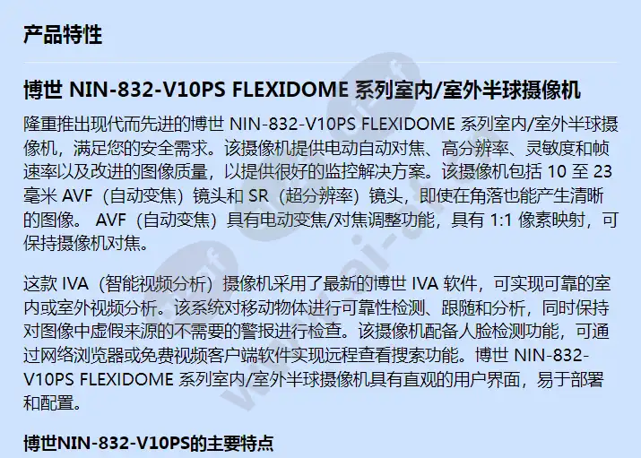 博世 NIN-832-V10PS FLEXIDOME 系列室内/室外半球摄像机 隆重推出现代而先进的博世 NIN-832-V10PS FLEXIDOME 系列室内/室外半球摄像机,满足您的安全需求。该摄像机提供电动自动对焦、高分辨率、灵敏度和帧速率以及改进的图像质量,以提供很好的监控解决方案。该摄像机包括 10 至 23 毫米 AVF(自动变焦)镜头和 SR(超分辨率)镜头,即使在角落也能产生清晰的图像。 AVF(自动变焦)具有电动变焦/对焦调整功能,具有 1:1 像素映射,可保持摄像机对焦。 这款 IVA(智能视频分析)摄像机采用了最新的博世 IVA 软件,可实现可靠的室内或室外视频分析。该系统对移动物体进行可靠性检测、跟随和分析,同时保持对图像中虚假来源的不需要的警报进行检查。该摄像机配备人脸检测功能,可通过网络浏览器或免费视频客户端软件实现远程查看搜索功能。博世 NIN-832-V10PS FLEXIDOME 系列室内/室外半球摄像机具有直观的用户界面,易于部署和配置。 博世NIN-832-V10PS的主要特点 iDNR 技术:评估场景以相应地减少噪声伪影,以实现有效压缩并最大限度地减少带宽消耗和存储使用。 C-BIT(基于内容的图像技术:提高所有光照条件下的图像质量。 IP66(NEMA Type 4X)标准、EN 50102、IK10 级设计:保护摄像机免受水和灰尘的影响,并使其防破坏和抗冲击。 1/2.7" CMOS 传感器:捕获 1952 x 1092 (2.03 Mp) 像素分辨率图像。 AVF(自动变焦):无需打开摄像机即可轻松更改变焦。 10 至 23 毫米超分辨率变焦镜头:采用先进的光圈设计,可产生高质量的图像。 摄像机风格: 半球 Durability: 防风雨 Environmental: Outdoor 保护码: IP66