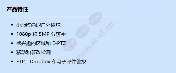 小巧时尚的户外微球 1080p 和 5MP 分辨率 感兴趣的区域和 E-PTZ 移动和篡改检测 FTP、Dropbox 和电子邮件警报 特征 自动增益控制、自动白平衡、背光补偿、日/夜、数字降噪、运动检测跟随、ONVIF、隐私遮蔽、防破坏、耐候、宽动态范围 技术 数字-IP 外壳颜色 白色 图像传感器 Day/Night (NO IR) 光学格式 1/2.7" 分辨率 高清:1920 x 1080 扫描方法 进步 压缩 H.264, MJPEG PoE等级 802.3af:≤ 4.0 W 环境 室外 (IP65+)、低温 (<14°F)、防破坏 (IK10+) 镜头 固定的 固定焦距 2.5 视频连接 RJ-45/12 内部存储器 存储卡插槽 力量 PoE, 12V 直流, 24V 交流 特殊功能 数字降噪、数字 PTZ、ONVIF 标准、隐私遮挡、视频移动侦测 协议 IPv4, IPv6, UDP, TCP, HTTP, HTTPS, RTP/RTCP, IGMP V2/V3, ICMP, ICMPv6, RTSP, FTP, Telnet, ARP, DHCP, NTP (SNTP), SNMP (V1, MIB-II), 802.1x、DNS、DNSv6、DDNS(DynDNS.org、selfHOST.de、noip.com)、SMTP、iSCSI、UPnP (SSDP)、DiffServ (QoS)、LLDP、SOAP、Dropbox 能量消耗 3.84 瓦(最大) 工作温度 -30 ºC 至 +50 ºC(-22 ºF 至 +122 ºF) 工作湿度 0% 至 95% 相对湿度(非冷凝) 很小场景照度 1080p 灵敏度(3200 K,反射率 89%,30IRE),0.4 lx(3.6 mm F1.6 镜头),1.0 lx(2.5 mm F2.8 镜头) 镜头尺