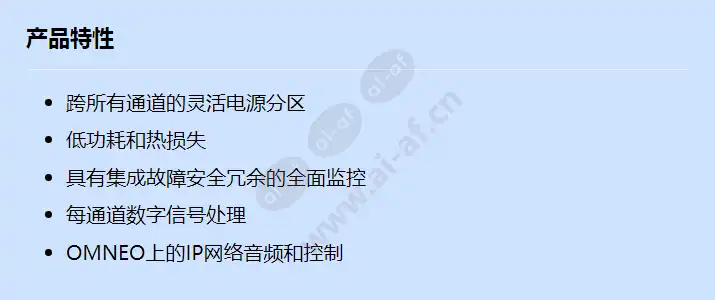 跨所有通道的灵活电源分区 低功耗和热损失 具有集成故障安全冗余的全面监控 每通道数字信号处理 OMNEO上的IP网络音频和控制 尺寸(高 x 宽 x 深)(毫米) 44 x 483 x 400 mm 加密 TLS 1.0; AES 频率响应(Hz) 20 – 20000 Hz 最大输出功率(W) 600 W 很小信噪比(dBA) 107 分贝 工作电压(VDC) 44 – 60 VDC 保护 过热; 超载; RMS 输出功率限制器; 接地故障; ; 直流输出; ; 备用通道; 生命线 协议/标准 OMNEO; AES70 采样率(kHz) 48 赫兹 信号处理 均衡;限制器;延迟;等级 重量(千克) 8.80 公斤