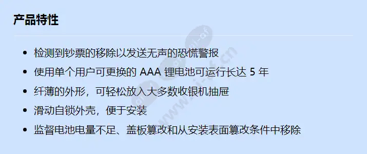 检测到钞票的移除以发送无声的恐慌警报 使用单个用户可更换的 AAA 锂电池可运行长达 5 年 纤薄的外形,可轻松放入大多数收银机抽屉 滑动自锁外壳,便于安装 监督电池电量不足、盖板篡改和从安装表面篡改条件中移除 电池类型 锂 颜色 黑色的 工作温度(°C) -10 – 49 °C 典型电池使用寿命(年) 5