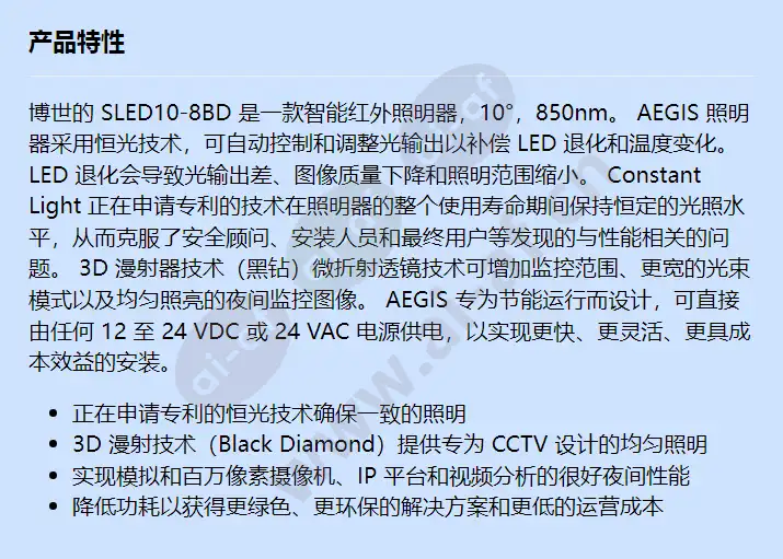 博世的 SLED10-8BD 是一款智能红外照明器,10°,850nm。 AEGIS 照明器采用恒光技术,可自动控制和调整光输出以补偿 LED 退化和温度变化。 LED 退化会导致光输出差、图像质量下降和照明范围缩小。 Constant Light 正在申请专利的技术在照明器的整个使用寿命期间保持恒定的光照水平,从而克服了安全顾问、安装人员和最终用户等发现的与性能相关的问题。 3D 漫射器技术(黑钻)微折射透镜技术可增加监控范围、更宽的光束模式以及均匀照亮的夜间监控图像。 AEGIS 专为节能运行而设计,可直接由任何 12 至 24 VDC 或 24 VAC 电源供电,以实现更快、更灵活、更具成本效益的安装。 正在申请专利的恒光技术确保一致的照明 3D 漫射技术(Black Diamond)提供专为 CCTV 设计的均匀照明 实现模拟和百万像素摄像机、IP 平台和视频分析的很好夜间性能 降低功耗以获得更绿色、更环保的解决方案和更低的运营成本 类型 半隐式 距离范围 100-199尺、200-299尺、300-399尺、400-499尺、500-599尺、600-699尺、700-799尺、800-899尺、900-999尺、1000+尺 电源输入 24VAC, 12-24VDC 角度范围 0-10°角度 波长 850 海里