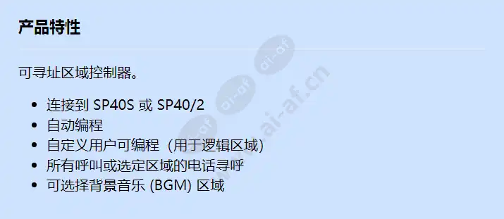 可寻址区域控制器。 连接到 SP40S 或 SP40/2 自动编程 自定义用户可编程(用于逻辑区域) 所有呼叫或选定区域的电话寻呼 可选择背景音乐 (BGM) 区域
